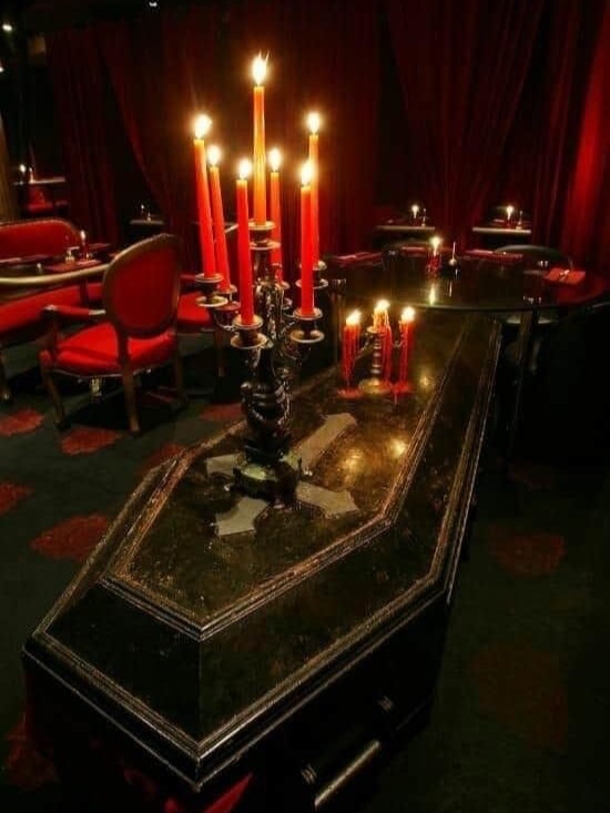 In einem prachtvoll dekorierten Saal erwartet die Gäste ein exklusives Vampir-Dinner. Bei Kerzenschein und in gotischer Atmosphäre wird ein mehrgängiges Menü serviert, das von der dunklen Eleganz der Vampirwelt inspiriert ist. Das Menü enthält edle, blutrote Weine, eigens kreierte Cocktails wie der "Blutkuss" und die "Nacht der Schatten". Die Speisen sind kunstvoll arrangiert, mit Details, die das Thema unterstreichen.